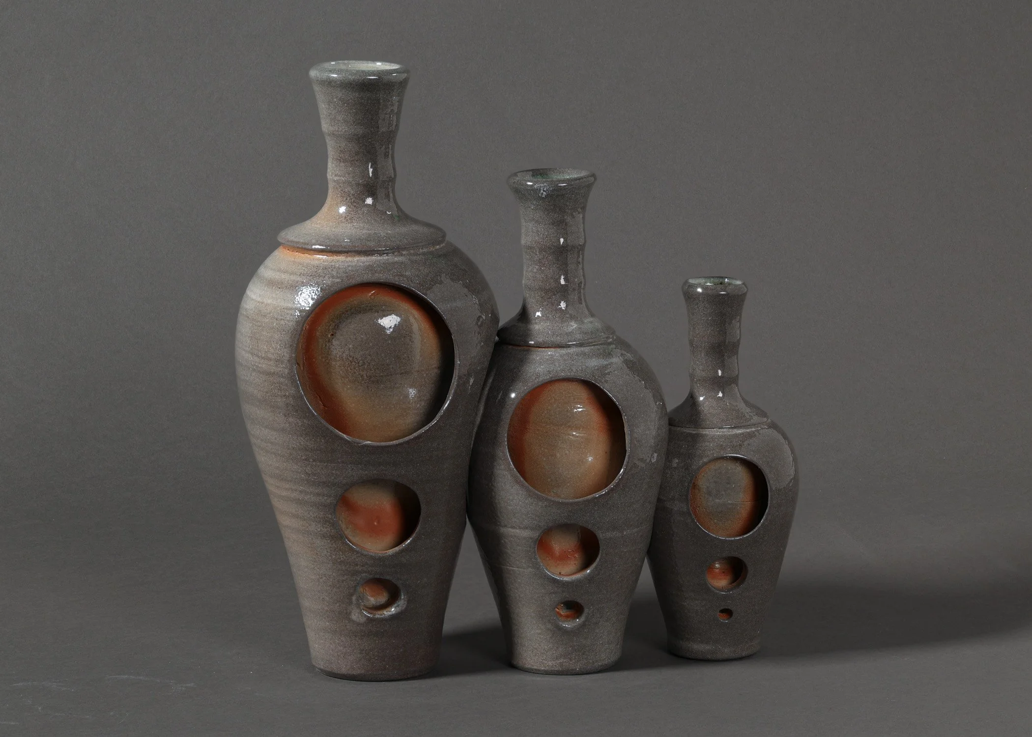 Every piece begins on the wheel, thrown clay separating out an intentional volume in space. I then push, pull, cut, and alter this space, interrupting smooth lines to slow down the pace with which one’s eyes move over a piece. They are decorated with wild clay slips and glazes I create from clay, wood, and rocks I collect in Maine, each piece imbued with a sense of place–a connection to the land that shapes our lives and communities. I finish my work in a soda kiln, utilizing the draft of the kiln to determine my surface markings. Soda firing is a process whereby sodium carbonate is introduced at peak temperature, where it vaporizes and turns into a glaze wherever it touches pots. The draft of the kiln pulls this glaze through the stack of wares, sealing the path of the flame forever on each surface. I reduction cool after soda is introduced, darkening the color profile and adding texture and depth to the glaze surface. This atmospheric firing process informs much of my practice, providing a context in which I can problem solve and push my line of artistic inquiry without being overwhelmed by the infinity of possible choices I face as a young maker. Influenced by contemporary atmospheric firing artists, I incorporate heavy ash or soda glaze and dramatic flash marks to add a narrative to my surfaces, spending hours meticulously stacking my wares. Then, utilizing the draft of an atmospheric kiln like light through a camera lens, I create an absence, defining my surfaces based on where the flames can deposit glaze.